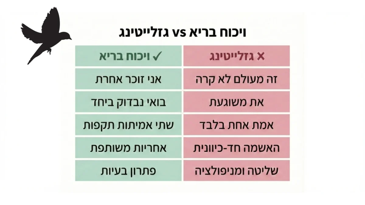חשוב להדגיש: אין בכך כדי לבטל מצבים שבהם השימוש במונח גזלייטינג חיוני ומגן. כאשר מתקיימת שלילה שיטתית של המציאות ואין אפשרות אמיתית לדיאלוג, הקריאה לדברים בשם היא צעד הכרחי. אך במצבים אחרים, השאלה החשובה אינה ״מי עושה גזלייטינג״ או ״מי אשם״, אלא ״איך אפשר לדבר על הפער בינינו בלי למחוק זה את זה״. מה שחשוב הוא לא מי צודק אלא איך מנהלים את הקשר והיחסים.